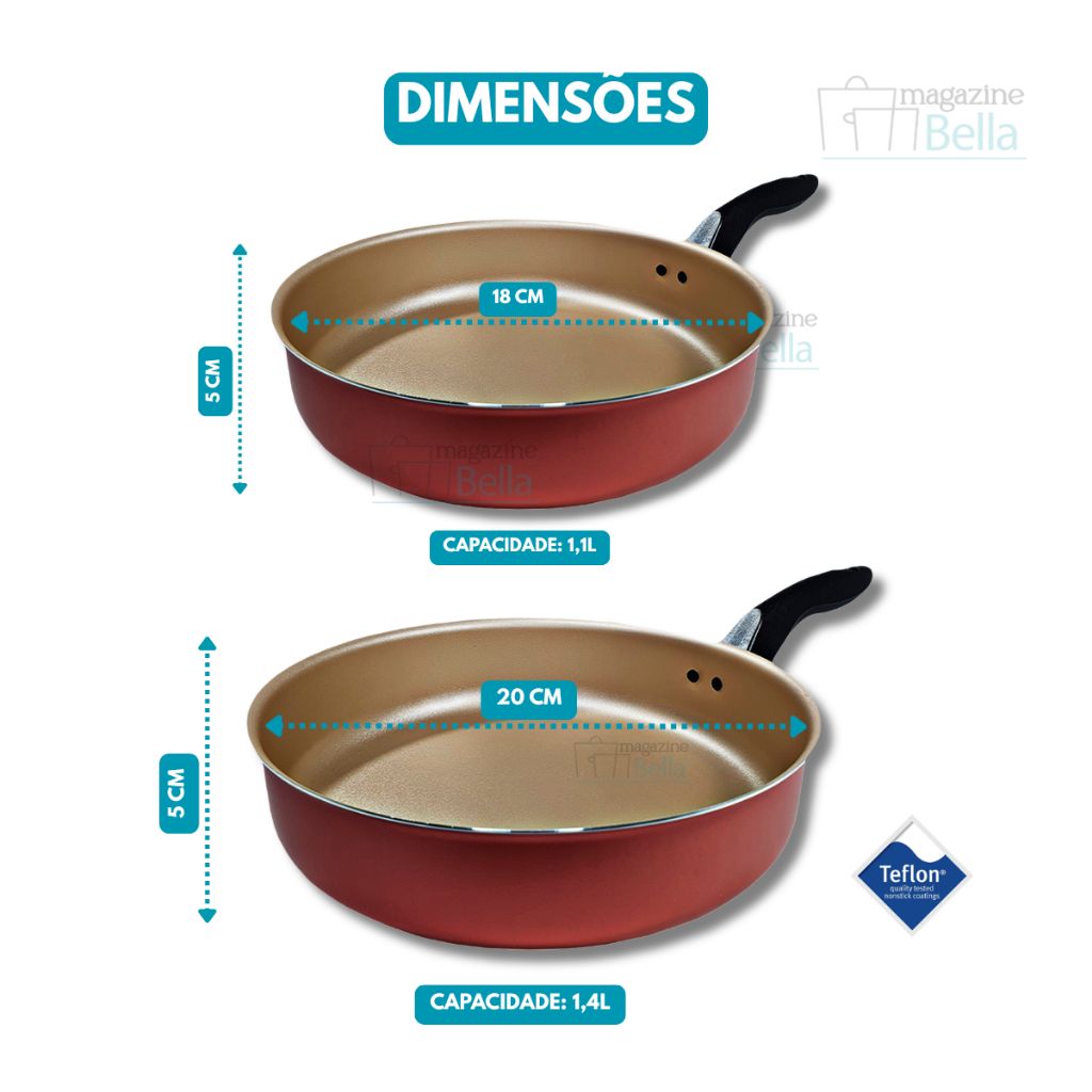 Kit 3 Peças - 2 Frigideiras Antiaderentes Com Tampa de Vidro Tamanho 18cm e 20cm + Espátula de NylonKit Conjunto 3 peças com Frigideira Antiaderente Premium – Alumínio Reforçado com 5 Camadas de Teflon™ | Cozimento Rápido e Fácil de LimparConteúdo do KIT: 1 Frigideira 18cm Com Tampa de Vidro + 1 Frigideira 20cm Com Tampa de Vidro + Espátula de Nylon - Fabricadas em alumínio de alta qualidade com 1,1 mm de espessura para maior resistência e durabilidade.- Distribuição uniforme de calor, que acelera o cozimento e evita pontos de queima.- Revestimento interno e externo com 5 camadas de antiaderente TEFLON™ (DuPont) – livre de PFOA.- Cozinhe com menos óleo: alimentos não grudam e ficam mais saudáveis.- Fácil de limpar, ideal para o dia a dia.- Cabo ergonômico em baquelite, que não esquenta e oferece segurança no manuseio.- Compatível com fogões a gás.- Design moderno e funcional, perfeito para sua cozinha.Especificações Técnicas:Dimensões aproximadas - cm: (A x D x C - Capacidade volume):- 1 Frigideira Alta 18 cm Antiaderente – (C x D x A): 34,5cm x 18cm x 05 cm - 1,1L- 1 Frigideira Alta 20 cm Antiaderente – (C x D x A): 34,5cm x 18cm x 05 cm - 1,4LMaterial: Alumínio RevestidoRevestimento Externo: Antiaderente – Cor:CerejaRevestimento Interno: Antiaderente – Cor: CerejaEspessUra Material: 1,1mmAlça: BaqueliteTampa: Tampa de Vidro TemperadoPeso Conjunto: 1 kg Recomendações:Antes de usar pela primeira vez, é importante fazer a limpeza e a cura da peça — isso ajuda a proteger o revestimento antiaderente e aumenta a durabilidade. Lave com uma esponja macia e detergente neutro, depois seque com um pano limpo. Passe um pouco de óleo ou outra gordura na parte de dentro e leve ao fogo baixo por 2 minutos. Deixe esfriar, lave de novo, seque... e pronto, já pode usar!Cuidados:- Pra conservar melhor e fazer seu produto durar mais, use só o lado macio da esponja na hora de lavar;- Não coloque o produto quente direto na água fria. Espere esfriar antes de lavar;- Use apenas utensílios de silicone ou nylon pra mexer os alimentos;- Evite deixar as alças e cabos em contato direto com o fogo ou calor por muito tempo;- Esse produto não vai ao forno nem ao micro-ondas;- Use no fogão só o tempo necessário pra cozinhar e sempre com fogo baixo ou médio (nunca acima de 350°C).Detalhes:- Garantia 30 dias contra defeitos de fabricação.- Itens decorativos não acompanham o produto. Imagens meramente ilustrativas - Para descarte dos produtos e embalagens siga as orientações de reciclagem vigente.Caso fique com alguma dúvida, entre em contato via Chat e iremos te auxiliar!