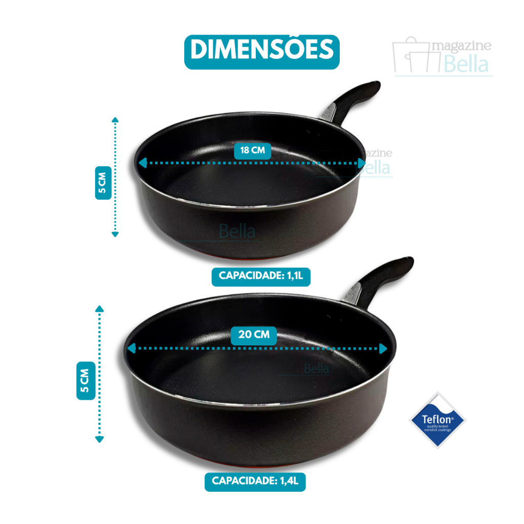 Kit Conjunto 2 peças com Frigideira Antiaderente Premium – Alumínio Reforçado com 5 Camadas de Teflon™ | Cozimento Rápido e Fácil de LimparConteúdo do KIT: 1 Frigideira 18cm Com Tampa de Vidro + 1 Frigideira 20cm Com Tampa de Vidro + 3 Espátulas Vermelhas - Fabricadas em alumínio de alta qualidade com 1,1 mm de espessura para maior resistência e durabilidade.- Distribuição uniforme de calor, que acelera o cozimento e evita pontos de queima.- Revestimento interno e externo com 5 camadas de antiaderente TEFLON™ (DuPont) – livre de PFOA.- Cozinhe com menos óleo: alimentos não grudam e ficam mais saudáveis.- Fácil de limpar, ideal para o dia a dia.- Cabo ergonômico em baquelite, que não esquenta e oferece segurança no manuseio.- Compatível com fogões a gás.- Design moderno e funcional, perfeito para sua cozinha.Especificações Técnicas:Dimensões aproximadas - cm: (A x D x C - Capacidade volume):- 1 Frigideira Alta 18 cm Antiaderente – (C x D x A): 34,5cm x 18cm x 05 cm - 1,1L- 1 Frigideira Alta 20 cm Antiaderente – (C x D x A): 34,5cm x 18cm x 05 cm - 1,4LMaterial: Alumínio RevestidoRevestimento Externo: Antiaderente – Cor:PretoRevestimento Interno: Antiaderente – Cor: PretoEspessUra Material: 1,1mmAlça: BaqueliteTampa: Tampa de Vidro TemperadoPeso Conjunto: 1 kg Recomendações:Antes de usar pela primeira vez, é importante fazer a limpeza e a cura da peça — isso ajuda a proteger o revestimento antiaderente e aumenta a durabilidade. Lave com uma esponja macia e detergente neutro, depois seque com um pano limpo. Passe um pouco de óleo ou outra gordura na parte de dentro e leve ao fogo baixo por 2 minutos. Deixe esfriar, lave de novo, seque... e pronto, já pode usar!Cuidados:- Pra conservar melhor e fazer seu produto durar mais, use só o lado macio da esponja na hora de lavar;- Não coloque o produto quente direto na água fria. Espere esfriar antes de lavar;- Use apenas utensílios de silicone ou nylon pra mexer os alimentos;- Evite deixar as alças e cabos em contato direto com o fogo ou calor por muito tempo;- Esse produto não vai ao forno nem ao micro-ondas;- Use no fogão só o tempo necessário pra cozinhar e sempre com fogo baixo ou médio (nunca acima de 350°C).Detalhes:- Garantia 30 dias contra defeitos de fabricação.- Itens decorativos não acompanham o produto. Imagens meramente ilustrativas - Para descarte dos produtos e embalagens siga as orientações de reciclagem vigente.Caso fique com alguma dúvida, entre em contato via Chat e iremos te auxiliar!