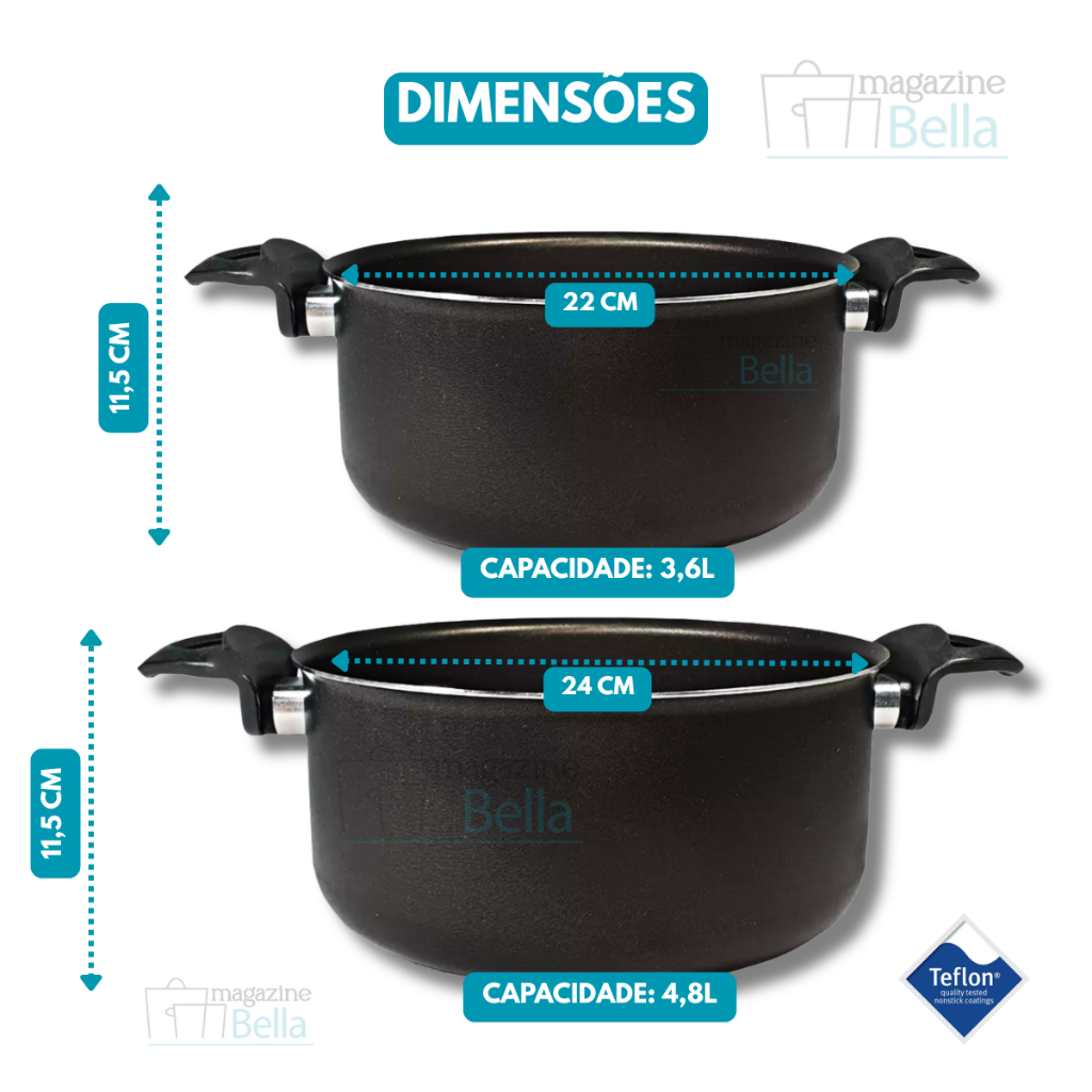 Kit Conjunto 4 Peças GRANDE 2 Panelas Caçarola 22cm e 24cm + Frigideira 24cm Antiaderente com 5 Camadas de TeflonKit Conjunto 4 peças com Panelas Antiaderente Premium – Alumínio Reforçado com 5 Camadas de Teflon™ | Cozimento Rápido e Fácil de LimparConteúdo do KIT: Kit 04 Peças, contendo 1 Panela Caçarola 22cm com tampa de Vidro + 1 Panela Caçarola 24cm com tampa de Vidro + 1 Frigideira 24cm Sem tampa de Vidro + 1 Espátula. - Fabricadas em alumínio de alta qualidade com 1,1 mm de espessura para maior resistência e durabilidade.- Distribuição uniforme de calor, que acelera o cozimento e evita pontos de queima.- Revestimento interno e externo com 5 camadas de antiaderente TEFLON™ (DuPont) – livre de PFOA.- Cozinhe com menos óleo: alimentos não grudam e ficam mais saudáveis.- Fácil de limpar, ideal para o dia a dia.- Cabo ergonômico em baquelite, que não esquenta e oferece segurança no manuseio.- Compatível com fogões a gás.- Design moderno e funcional, perfeito para sua cozinha.Especificações Técnicas:Dimensões aproximadas - cm: (A x D - Capacidade volume):- 1 Caçarola 22 cm de diâmetro c/ tampa de vidro – (A x D): 11,5cm x 22cm - 3,6L- 1 Caçarola 24 cm de diâmetro c/ tampa de vidro – (A x D): 11,5cm x 24cm - 4,8L- 1 Frigideira Alta 24 cm Antiaderente – (A x D): 7,5cm x 24cm - 2,3LMaterial: Alumínio RevestidoRevestimento Externo: Antiaderente – Cor: PRETORevestimento Interno: Antiaderente – Cor: PRETOEspessUra Material: 1,1mmAlça: BaqueliteTampa: Tampa de Vidro TemperadoPeso Conjunto: 1830 kg Recomendações:Antes de usar pela primeira vez, é importante fazer a limpeza e a cura da peça — isso ajuda a proteger o revestimento antiaderente e aumenta a durabilidade. Lave com uma esponja macia e detergente neutro, depois seque com um pano limpo. Passe um pouco de óleo ou outra gordura na parte de dentro e leve ao fogo baixo por 2 minutos. Deixe esfriar, lave de novo, seque... e pronto, já pode usar!Cuidados:- Pra conservar melhor e fazer seu produto durar mais, use só o lado macio da esponja na hora de lavar;- Não coloque o produto quente direto na água fria. Espere esfriar antes de lavar;- Use apenas utensílios de silicone ou nylon pra mexer os alimentos;- Evite deixar as alças e cabos em contato direto com o fogo ou calor por muito tempo;- Esse produto não vai ao forno nem ao micro-ondas;- Use no fogão só o tempo necessário pra cozinhar e sempre com fogo baixo ou médio (nunca acima de 350°C).Detalhes:- Garantia 30 dias contra defeitos de fabricação.- Itens decorativos não acompanham o produto. Imagens meramente ilustrativas - Para descarte dos produtos e embalagens siga as orientações de reciclagem vigente.Caso fique com alguma dúvida, entre em contato via Chat e iremos te auxiliar!