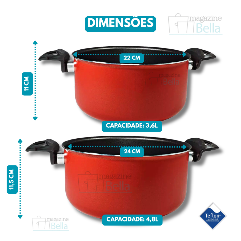 Kit Conjunto 6 peças com Panelas Antiaderente Premium – Alumínio Reforçado com 5 Camadas de Teflon™ | Cozimento Rápido e Fácil de LimparConteúdo do KIT: Kit 06 Peças, contendo 1 Panela Caçarola 22cm com tampa de Vidro + 1 Panela Caçarola 24cm com tampa de Vidro + 1 Frigideira 24cm Sem tampa de Vidro + 3 Espátulas. - Fabricadas em alumínio de alta qualidade com 1,1 mm de espessura para maior resistência e durabilidade.- Distribuição uniforme de calor, que acelera o cozimento e evita pontos de queima.- Revestimento interno e externo com 5 camadas de antiaderente TEFLON™ (DuPont) – livre de PFOA.- Cozinhe com menos óleo: alimentos não grudam e ficam mais saudáveis.- Fácil de limpar, ideal para o dia a dia.- Cabo ergonômico em baquelite, que não esquenta e oferece segurança no manuseio.- Compatível com fogões a gás.- Design moderno e funcional, perfeito para sua cozinha.Especificações Técnicas:Dimensões aproximadas - cm: (A x D - Capacidade volume):- 1 Caçarola 22 cm de diâmetro c/ tampa de vidro – (A x D x C) 11,5cm x 16cm - 3,6L- 1 Caçarola 24 cm de diâmetro c/ tampa de vidro – (A x D x C): 11,5cm x 24cm - 4,8L- 1 Frigideira Alta 24 cm Antiaderente – (A x D x C): 7,5cm x 24cm - 2,3LMaterial: Alumínio RevestidoRevestimento Externo: Antiaderente – Cor: PRETORevestimento Interno: Antiaderente – Cor: PRETOEspessura Material: 1,1mmAlça: BaqueliteTampa: Tampa de Vidro TemperadoPeso Conjunto: 1830 kg Recomendações:Antes de usar pela primeira vez, é importante fazer a limpeza e a cura da peça — isso ajuda a proteger o revestimento antiaderente e aumenta a durabilidade. Lave com uma esponja macia e detergente neutro, depois seque com um pano limpo. Passe um pouco de óleo ou outra gordura na parte de dentro e leve ao fogo baixo por 2 minutos. Deixe esfriar, lave de novo, seque... e pronto, já pode usar!Cuidados:- Pra conservar melhor e fazer seu produto durar mais, use só o lado macio da esponja na hora de lavar;- Não coloque o produto quente direto na água fria. Espere esfriar antes de lavar;- Use apenas utensílios de silicone ou nylon pra mexer os alimentos;- Evite deixar as alças e cabos em contato direto com o fogo ou calor por muito tempo;- Esse produto não vai ao forno nem ao micro-ondas;- Use no fogão só o tempo necessário pra cozinhar e sempre com fogo baixo ou médio (nunca acima de 350°C).Detalhes:- Garantia 30 dias contra defeitos de fabricação.- Itens decorativos não acompanham o produto. Imagens meramente ilustrativas - Para descarte dos produtos e embalagens siga as orientações de reciclagem vigente.Caso fique com alguma dúvida, entre em contato via Chat e iremos te auxiliar!