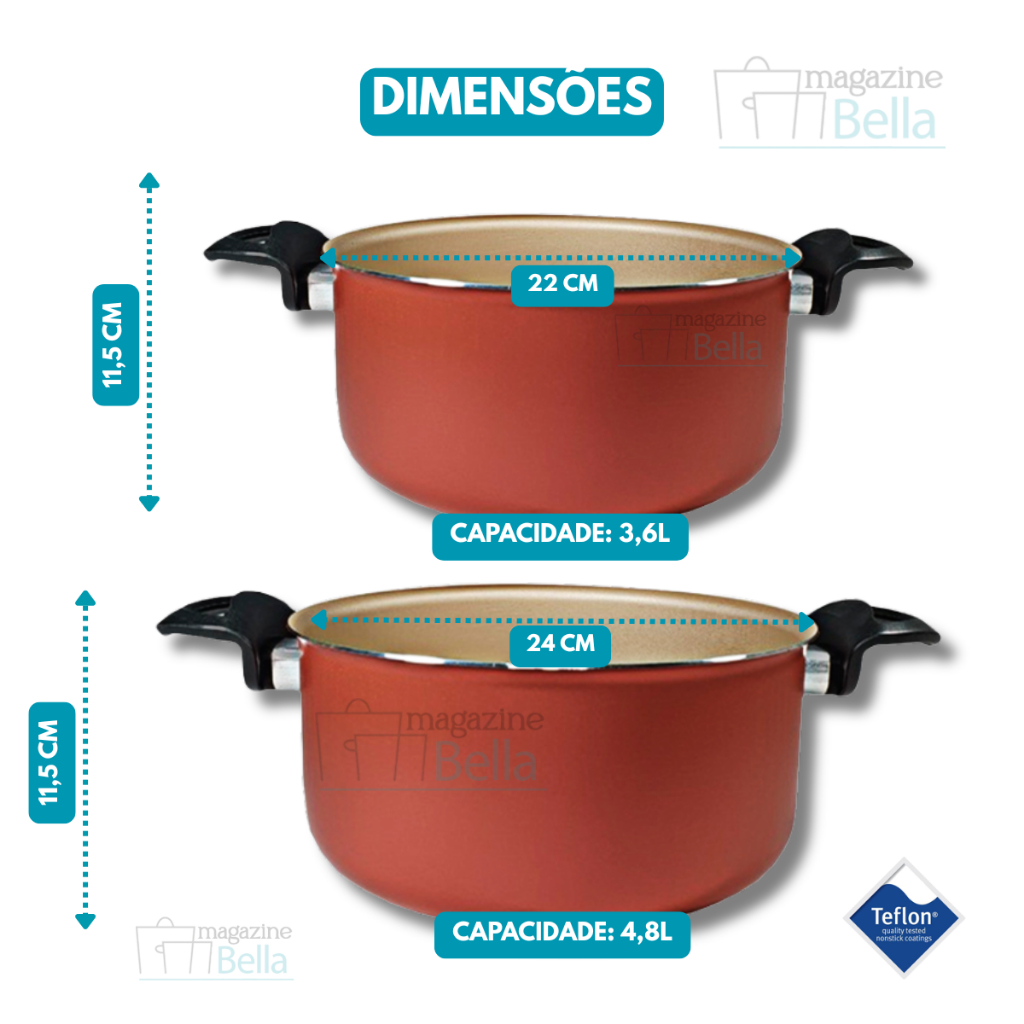 Kit Conjunto 6 peças com Panelas Antiaderente Premium – Alumínio Reforçado com 5 Camadas de Teflon™ | Cozimento Rápido e Fácil de LimparConteúdo do KIT: Kit 06 Peças, contendo 1 Panela Caçarola 20cm com tampa de Vidro + 1 Panela Caçarola 22cm com tampa de Vidro + 1 Frigideira 22cm Sem tampa de Vidro + 3 Espátulas. - Fabricadas em alumínio de alta qualidade com 1,1 mm de espessura para maior resistência e durabilidade.- Distribuição uniforme de calor, que acelera o cozimento e evita pontos de queima.- Revestimento interno e externo com 5 camadas de antiaderente TEFLON™ (DuPont) – livre de PFOA.- Cozinhe com menos óleo: alimentos não grudam e ficam mais saudáveis.- Fácil de limpar, ideal para o dia a dia.- Cabo ergonômico em baquelite, que não esquenta e oferece segurança no manuseio.- Compatível com fogões a gás.- Design moderno e funcional, perfeito para sua cozinha.Especificações Técnicas:Dimensões aproximadas - cm: (A x D - Capacidade volume):- 1 Caçarola 22 cm de diâmetro c/ tampa de vidro – (A x D x C) 11,5cm x 16cm - 3,6L- 1 Caçarola 24 cm de diâmetro c/ tampa de vidro – (A x D x C): 11,5cm x 24cm - 4,8L- 1 Frigideira Alta 24 cm Antiaderente – (A x D x C): 7,5cm x 24cm - 2,3LMaterial: Alumínio RevestidoRevestimento Externo: Antiaderente – Cor: CEREJARevestimento Interno: Antiaderente – Cor: CEREJAEspessura Material: 1,1mmAlça: BaqueliteTampa: Tampa de Vidro TemperadoPeso Conjunto: 1830 kg Recomendações:Antes de usar pela primeira vez, é importante fazer a limpeza e a cura da peça — isso ajuda a proteger o revestimento antiaderente e aumenta a durabilidade. Lave com uma esponja macia e detergente neutro, depois seque com um pano limpo. Passe um pouco de óleo ou outra gordura na parte de dentro e leve ao fogo baixo por 2 minutos. Deixe esfriar, lave de novo, seque... e pronto, já pode usar!Cuidados:- Pra conservar melhor e fazer seu produto durar mais, use só o lado macio da esponja na hora de lavar;- Não coloque o produto quente direto na água fria. Espere esfriar antes de lavar;- Use apenas utensílios de silicone ou nylon pra mexer os alimentos;- Evite deixar as alças e cabos em contato direto com o fogo ou calor por muito tempo;- Esse produto não vai ao forno nem ao micro-ondas;- Use no fogão só o tempo necessário pra cozinhar e sempre com fogo baixo ou médio (nunca acima de 350°C).Detalhes:- Garantia 30 dias contra defeitos de fabricação.- Itens decorativos não acompanham o produto. Imagens meramente ilustrativas - Para descarte dos produtos e embalagens siga as orientações de reciclagem vigente.Caso fique com alguma dúvida, entre em contato via Chat e iremos te auxiliar!